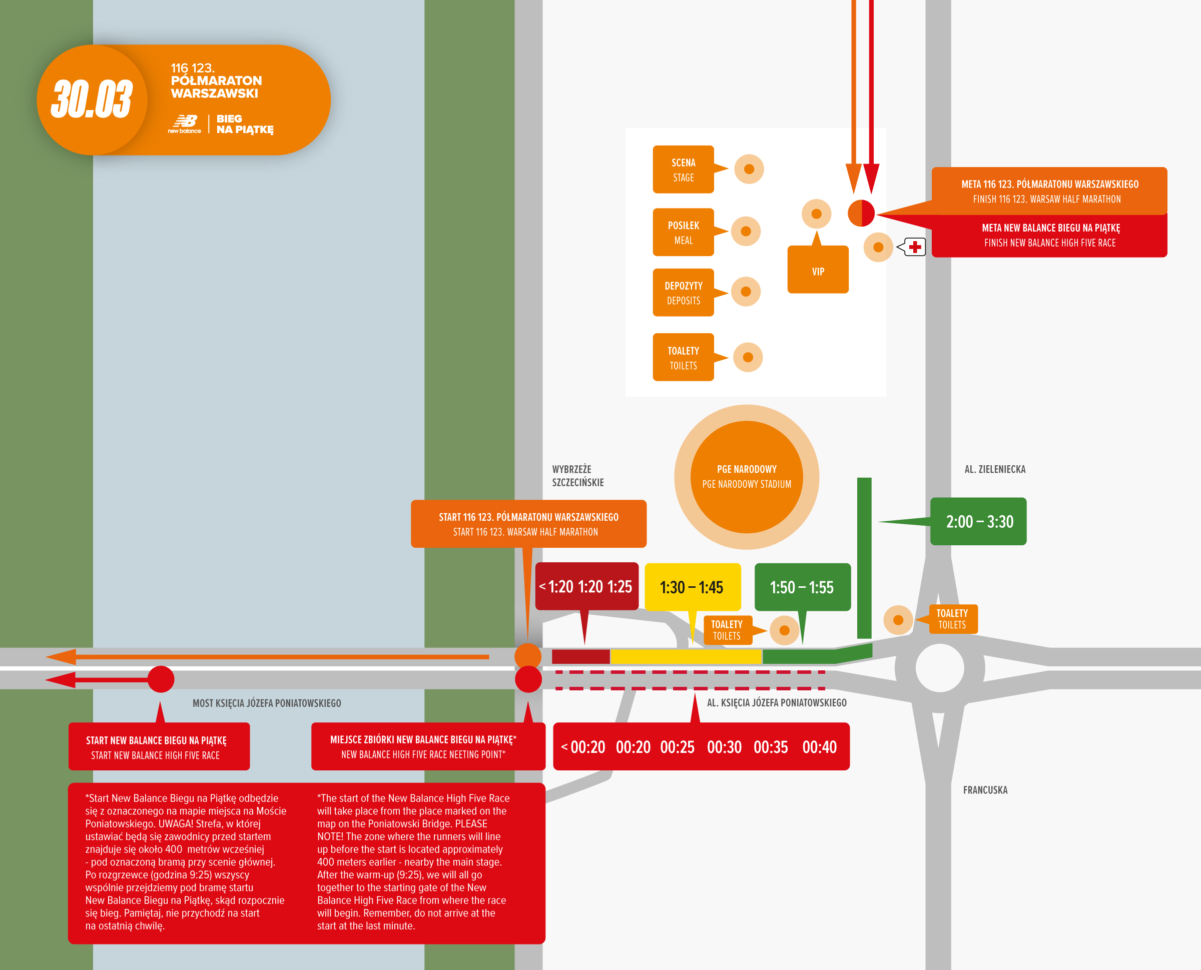 Rekomendujemy dojazd do stacji metra Stadion Narodowy (wyjście z metra nr 7) i przejście na Błonia PGE Narodowego do Miasteczka z depozytami oraz na start biegów (Most Poniatowskiego).